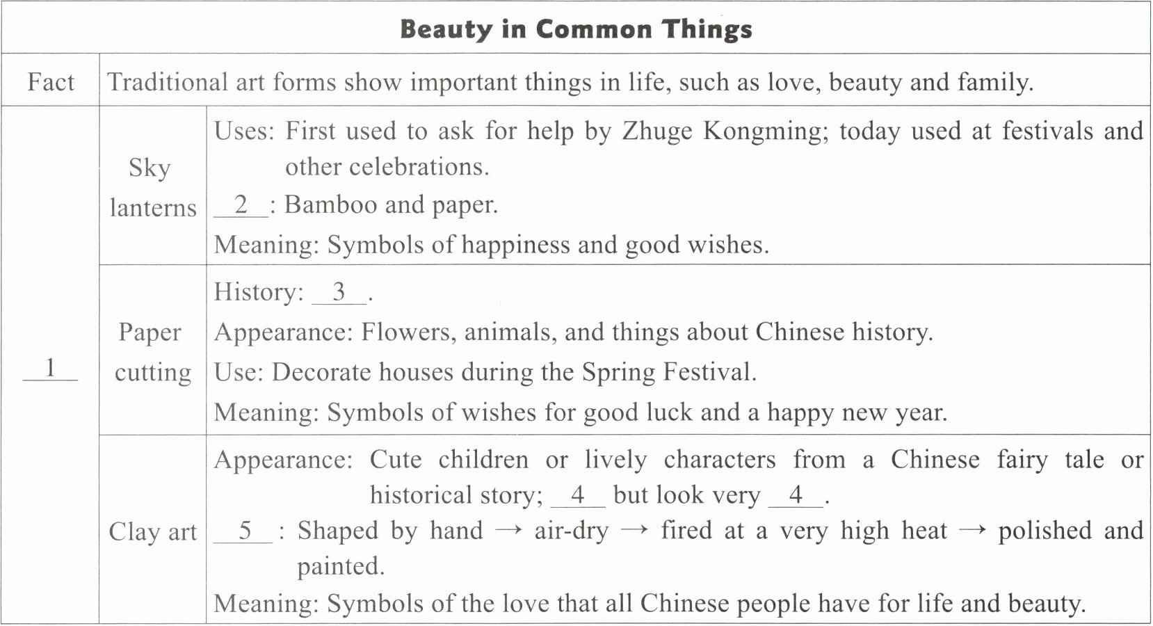 1. 对于第一个空,需要确定与“Paper cutting”对应的类别,从整体结构看,这里应该是大类别,结合常识和课文内容可知是“Art forms”。