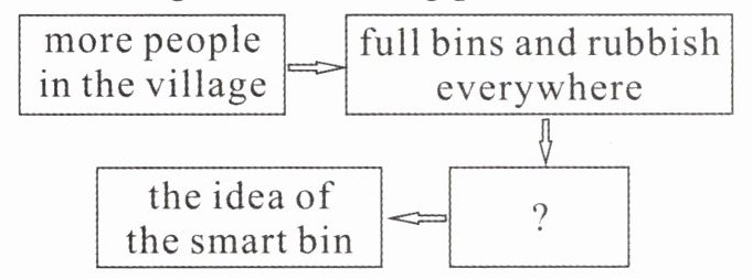 3. 根据图表和文中描述,智能垃圾桶的发明是由于村里来了更多的人,导致垃圾桶满溢,垃圾遍地。因此,缺失的部分应该是与垃圾相关的内容。