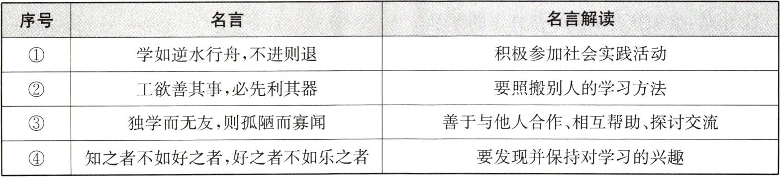 D 解析“学如逆水行舟,不进则退”的意思是,学习要不断进取、不断努力,就像逆水行驶的小船,不努力向前,就只能向后退,这与积极参加社会实践活动无关,①排除;“工欲善其事,必先利其器”说明要掌握科学的学习方法,找到适合自己的学习方法,不能照搬别人的学习方法,②错误;“独学而无友,则孤陋而寡闻”说明要善于与他人合作、相互帮助、探讨交流,③正确;“知之者不如好之者,好之者不如乐之者”说明要发现并保持对学习的兴趣,④正确。