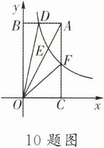 10. 矩形OBAC在平面直角坐标系中的位置如图所示,反比例函数$y= \frac{k}{x}$的图象与AB边交于点D,与AC边交于点F,与OA交于点E,$OE= 2AE$,若四边形ODAF的面积为2,则k的值是