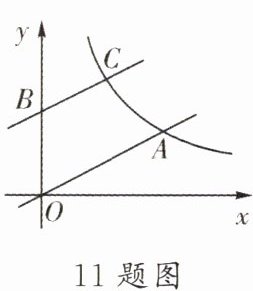 11. 如图,在平面直角坐标系中,点O是坐标原点,点$A(4,2)在函数y= \frac{k}{x}(k>0,x>0)$的图象上.将直线OA沿y轴向上平移,平移后的直线与y轴交于点B,与函数$y= \frac{k}{x}(k>0,x>0)$的图象交于点C.若$BC= \sqrt{5}$,则点B的坐标是______.(