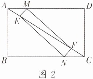 (2)如图 2,若 AE= CF= $\frac{5-\sqrt{13}}{2}$,AM= CN= x(0<x<2),且四边形 EMFN 为矩形,求 x 的值.