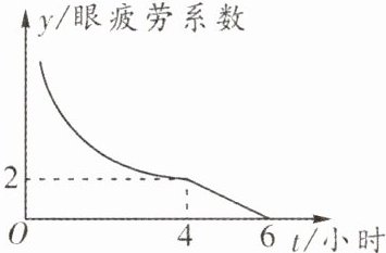 9. ▶中考热点•生活情境 某项研究表明:人的眼睛疲劳系数y与睡眠时间t之间成函数关系,它们之间的关系如图所示.其中,当睡眠时间不超过4小时(0<t≤4)时,眼睛疲劳系数y是睡眠时间t的反比例函数;当睡眠时间不少于4小时(4≤t≤6)时,眼睛疲劳系数y是睡眠时间t的一次函数,且当睡眠时间达到6小时后,眼睛疲劳系数为0.根据图象,回答下列问题: