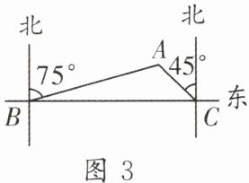 .(3)如图3,为了开发三角形荒地ABC,测量人员在B点测得A在北偏东75°方向上,沿笔直公路向正东方向行驶18 km到达C点,测得A在北偏西45°方向上.根据以上信息,求三角形荒地的面积.(参考数值:sin15°≈0.3,sin120°≈0.9,$\sqrt{2}≈1.4,$结果取整数)