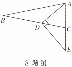8. 如图,在△ABC中,AB= BC,$tan∠B= \frac{5}{12},$D为BC上一点,若满足$CD= \frac{5}{8}BD,$过点D作DE⊥AD,交AC的延长线于点E,则\frac{CE}{AC}= ______