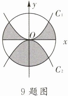 9. 如图,⊙O的半径为2,$C_1是函数y= \frac{1}{2}x^2$的图象,$C_2是函数y= -\frac{1}{2}x^2$的图象,则阴影部分的面积是