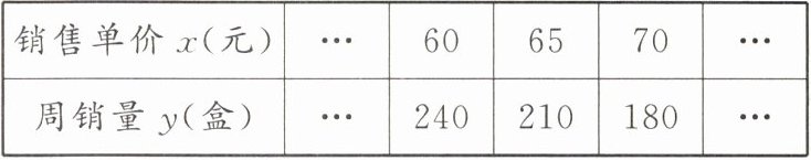6. 某商家销售一种糕点,每盒进价为40元. 在销售过程中发现,周销量y(盒)与销售单价x(元)之间满足一次函数关系,其部分对应数据如表所示: