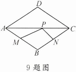 9. 如图,点P是边长为1的菱形ABCD对角线AC上的一个动点,点M,N分别是AB,BC边上的中点,则MP+PN的最小值是
