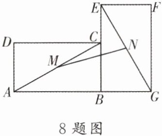 8. 如图,将矩形ABCD绕点B顺时针旋转90°至矩形EBGF的位置,连接AC,EG,取AC,EG的中点M,N,连接MN,若AB= 8,BC= 6,则MN= (