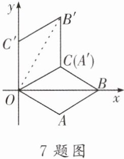7. 如图,在平面直角坐标系中,菱形OABC的边长为2√6,点B在x轴的正半轴上,且∠AOC= 60°,将菱形OABC绕原点O逆时针方向旋转60°,得到四边形OA'B'C'(点A'与点C重合),则点B'的坐标是(