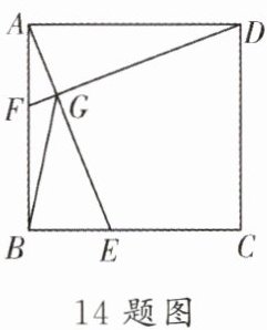 14. 如图,正方形ABCD的边长为4,点F与点E是线段AB与线段BC上的两个动点,在运动过程中线段DF与AE始终保持垂直,则线段BG的最小值是(
