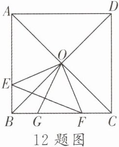 12. 如图,正方形ABCD的面积为16,对角线AC,BD相交于点O,点E,F分别在边AB,BC上运动,∠EOF= 90°,OG平分∠EOF,与边BC交于点G. 有下列结论:①OE= OF;②四边形OEBF的面积保持4不变;③$BG^{2}+CF^{2}= GF^{2}$;④EF的最小值为$2\sqrt{2}$. 其中正确说法的序号是
