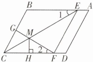 11. 如图,在平行四边形ABCD中,CE平分∠BCD,交AB边于点E,EF//BC,交CD于点F,点G是BC边的中点,连接GF,且∠1= ∠2,CE与GF交于点M,过点M作MH⊥CD于点H.