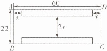 2. 如图,小区物业规划在一个长60 m、宽22 m的矩形场地ABCD上,修建一个小型停车场,阴影部分为停车位所在区域,两侧是宽x m的道路,中间是宽2x m的道路. 如果阴影部分的总面积是$600 m^2,$那么x满足的方程是(