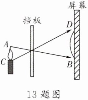 13. 如图是“小孔成像”,蜡烛到挡板距离与挡板到屏幕距离之比是$1:2$,若烛焰$AC的高是4\ cm$,则实像$DB$的高是