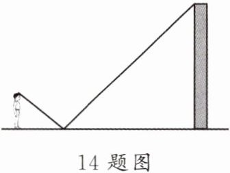 14. 小明用这样的方法来测量某建筑物的高度. 如图,在地面上放一面镜子,调整位置,直至刚好能从镜子中看到建筑物的顶端. 如果此时小明与镜子的距离是$2\ m$,镜子与建筑物的距离是$20\ m$,他的眼睛距地面$1.5\ m$,那么该建筑物的高是
