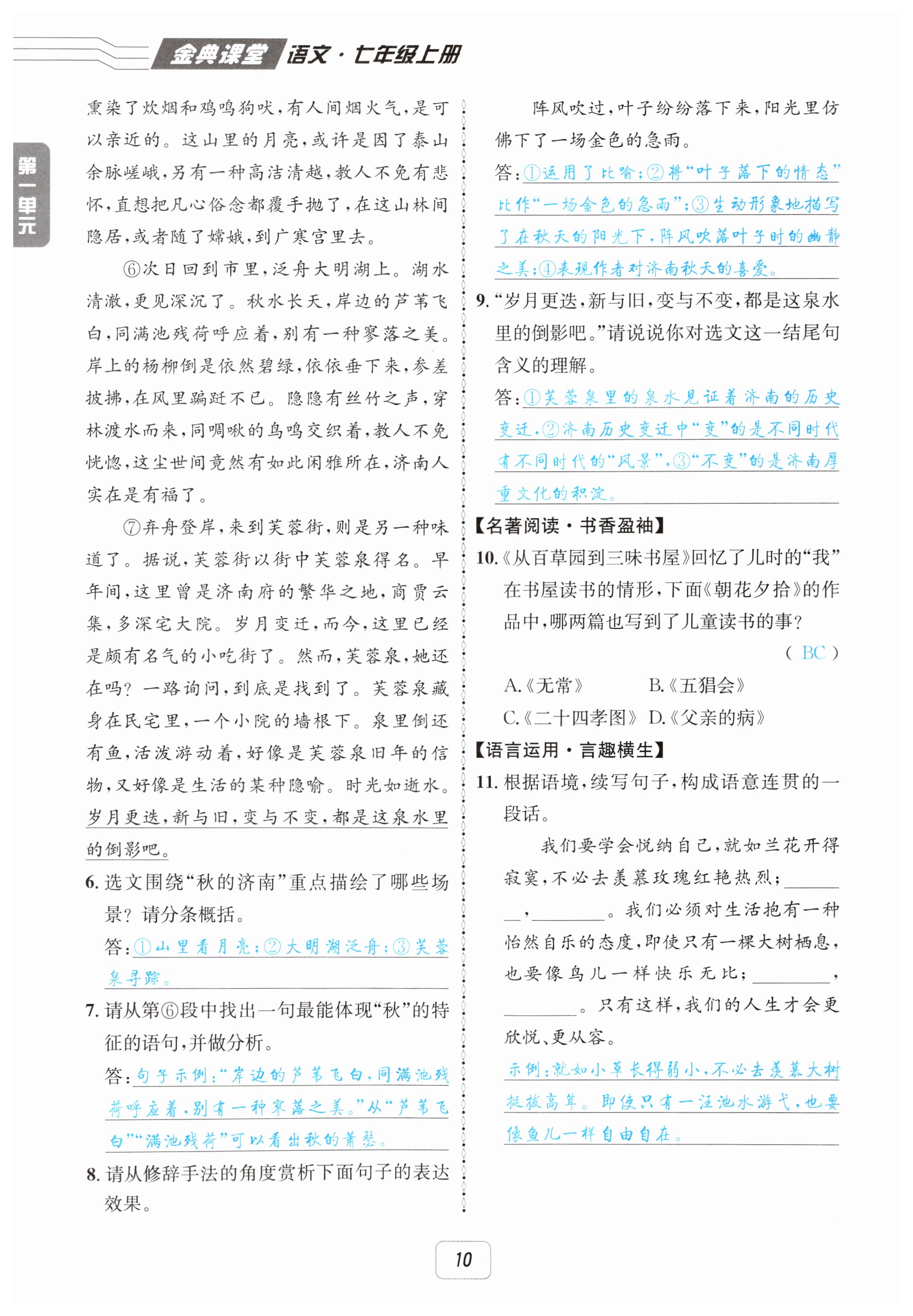 注:目前有些书本章节名称可能整理的还不是很完善,但都是按照顺序排列的,请同学们按照顺序仔细查找。练习册 2025年名校金典课堂七年级语文上册人教版 答案主要是用来给同学们做完题方便对答案用的,请勿直接抄袭。