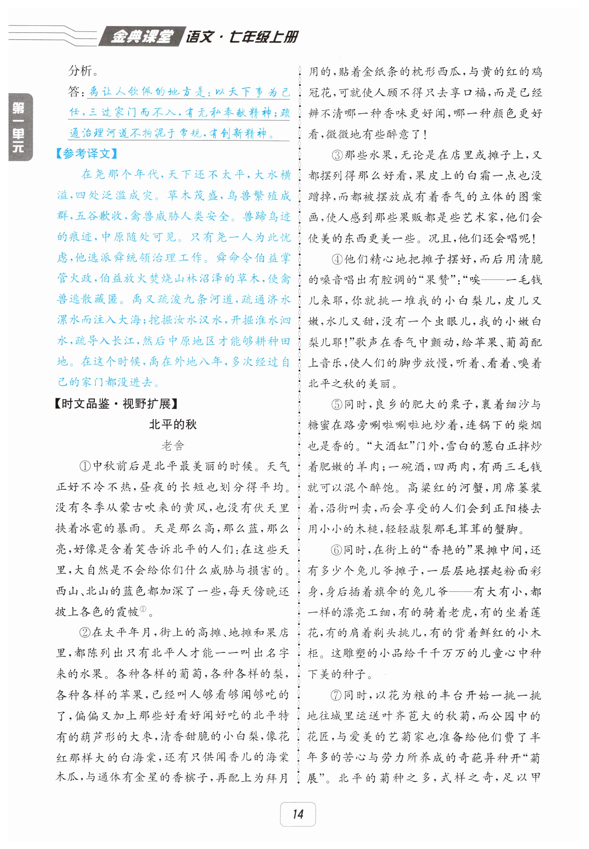 注:目前有些书本章节名称可能整理的还不是很完善,但都是按照顺序排列的,请同学们按照顺序仔细查找。练习册 2025年名校金典课堂七年级语文上册人教版 答案主要是用来给同学们做完题方便对答案用的,请勿直接抄袭。