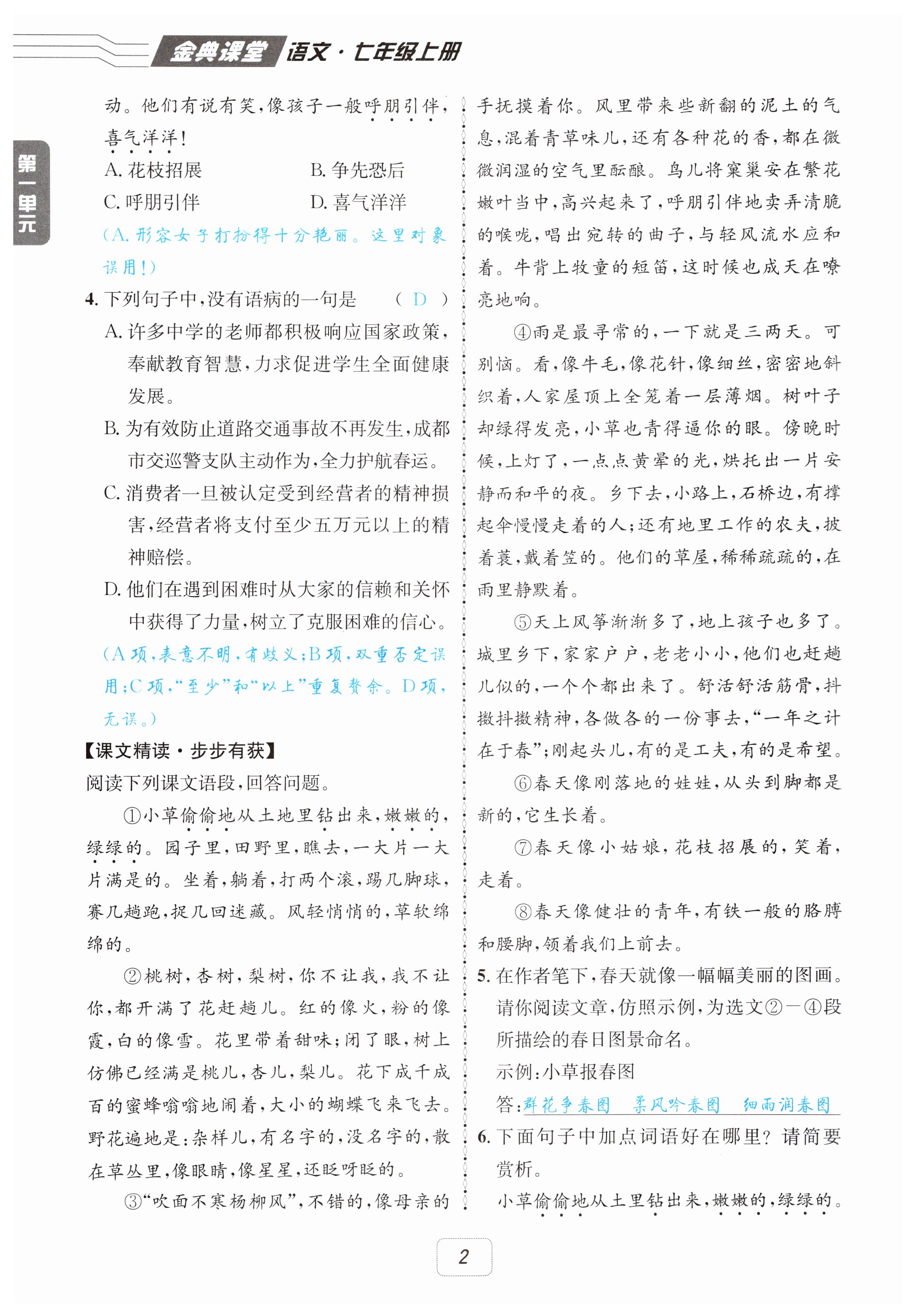 注:目前有些书本章节名称可能整理的还不是很完善,但都是按照顺序排列的,请同学们按照顺序仔细查找。练习册 2025年名校金典课堂七年级语文上册人教版 答案主要是用来给同学们做完题方便对答案用的,请勿直接抄袭。