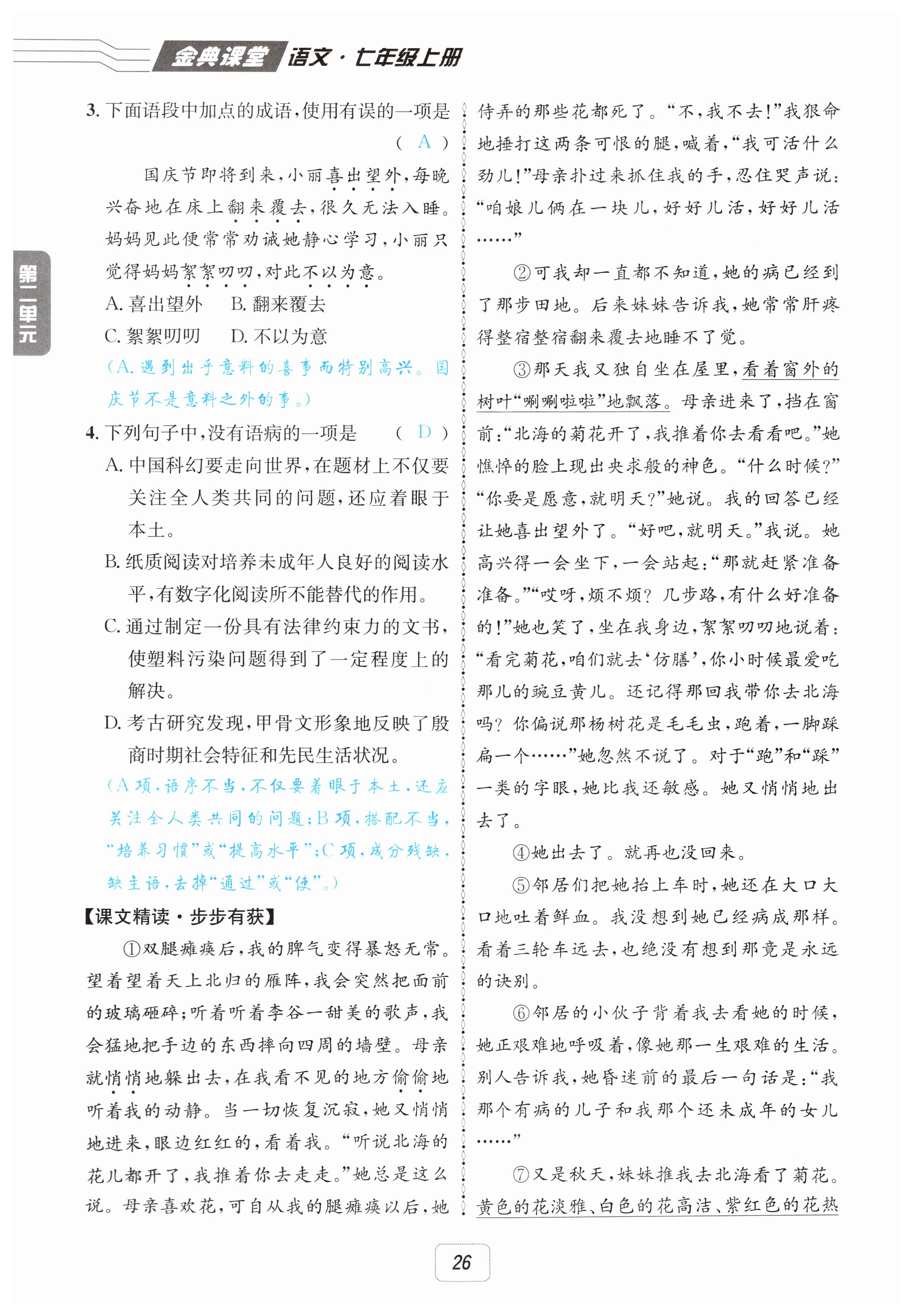 注:目前有些书本章节名称可能整理的还不是很完善,但都是按照顺序排列的,请同学们按照顺序仔细查找。练习册 2025年名校金典课堂七年级语文上册人教版 答案主要是用来给同学们做完题方便对答案用的,请勿直接抄袭。