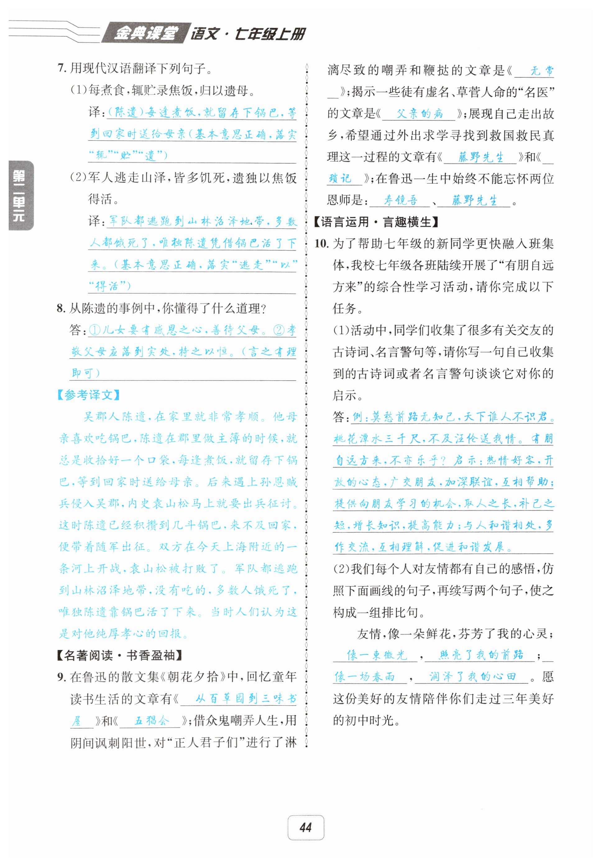 注:目前有些书本章节名称可能整理的还不是很完善,但都是按照顺序排列的,请同学们按照顺序仔细查找。练习册 2025年名校金典课堂七年级语文上册人教版 答案主要是用来给同学们做完题方便对答案用的,请勿直接抄袭。