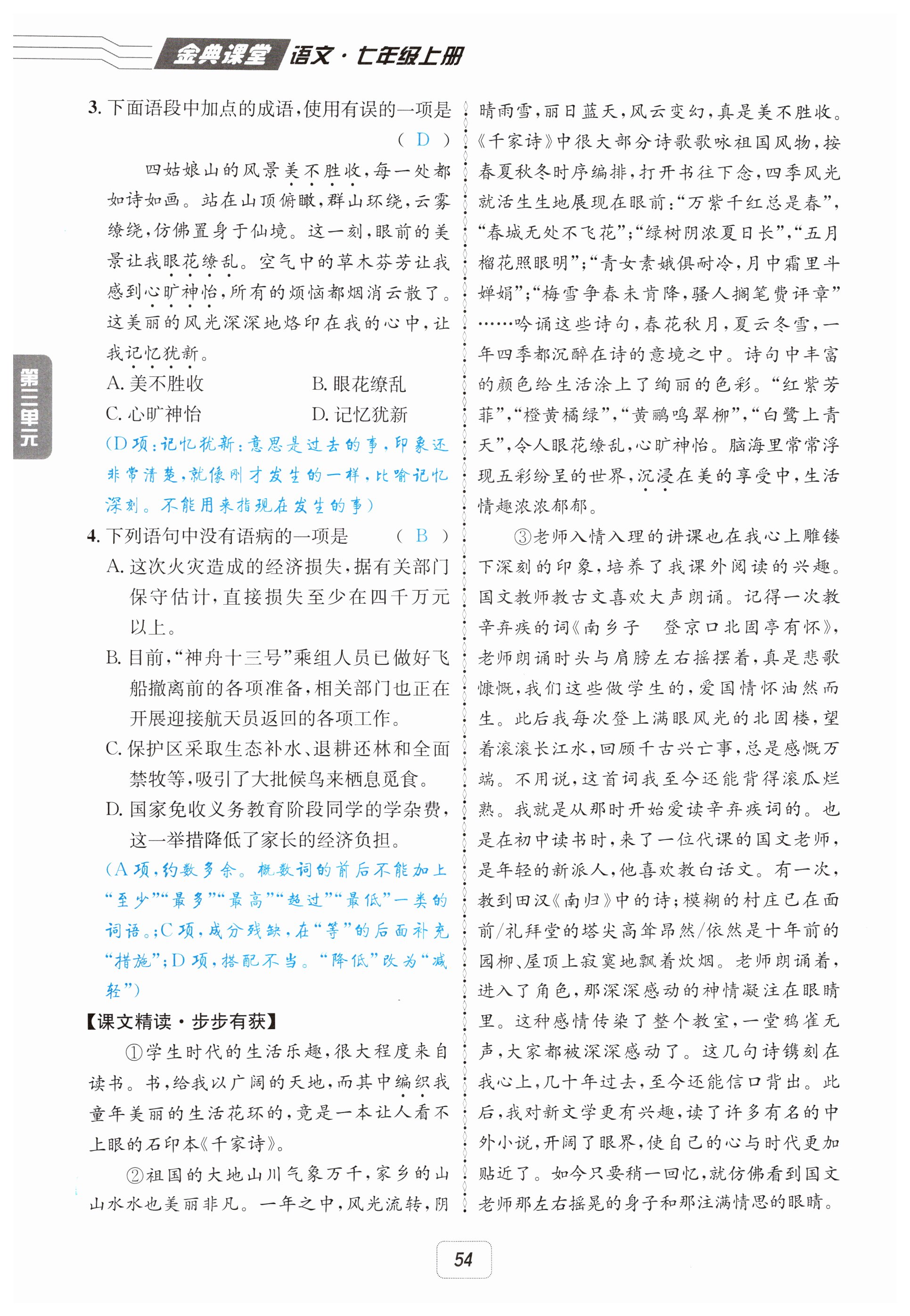 注:目前有些书本章节名称可能整理的还不是很完善,但都是按照顺序排列的,请同学们按照顺序仔细查找。练习册 2025年名校金典课堂七年级语文上册人教版 答案主要是用来给同学们做完题方便对答案用的,请勿直接抄袭。