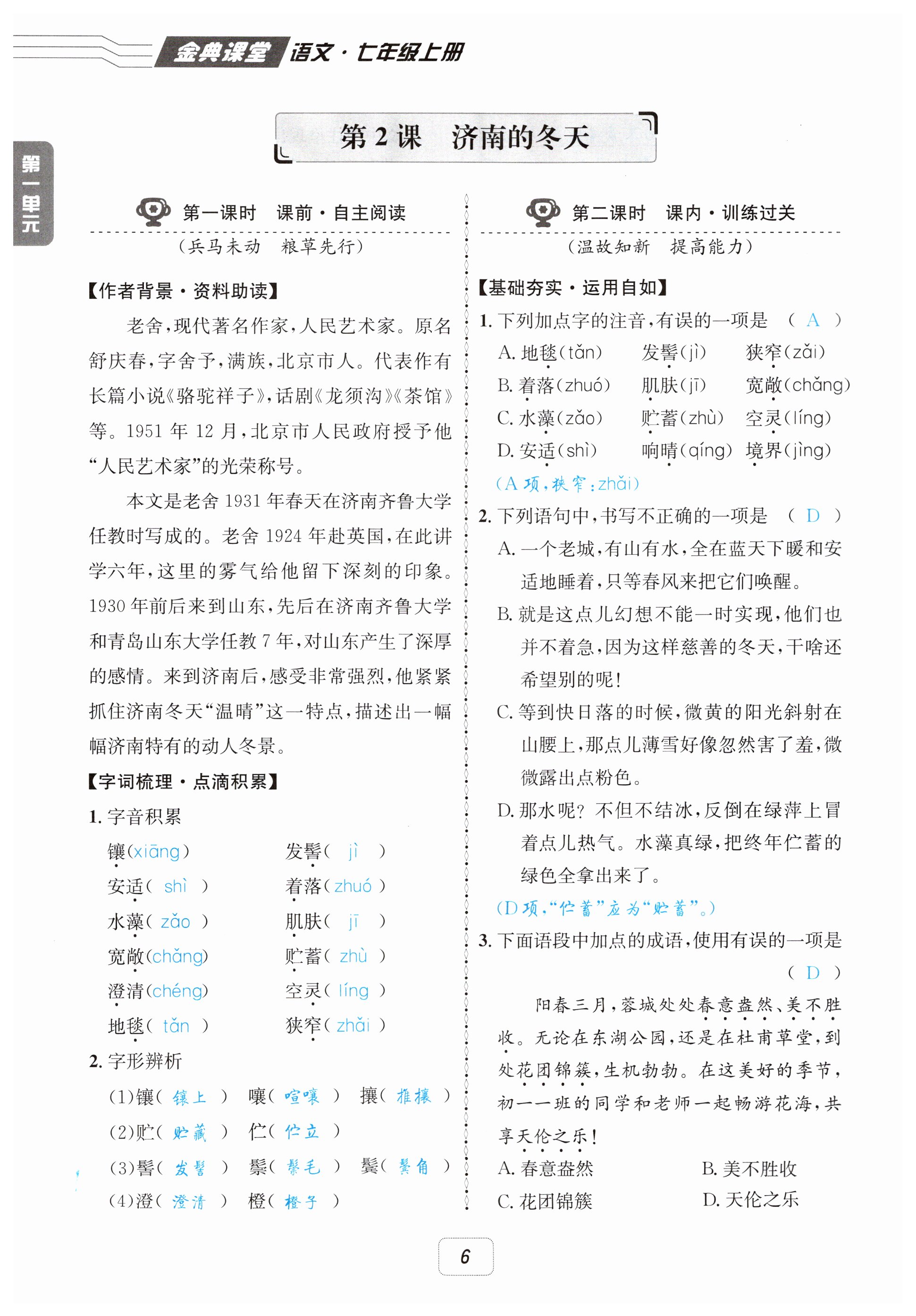 注:目前有些书本章节名称可能整理的还不是很完善,但都是按照顺序排列的,请同学们按照顺序仔细查找。练习册 2025年名校金典课堂七年级语文上册人教版 答案主要是用来给同学们做完题方便对答案用的,请勿直接抄袭。