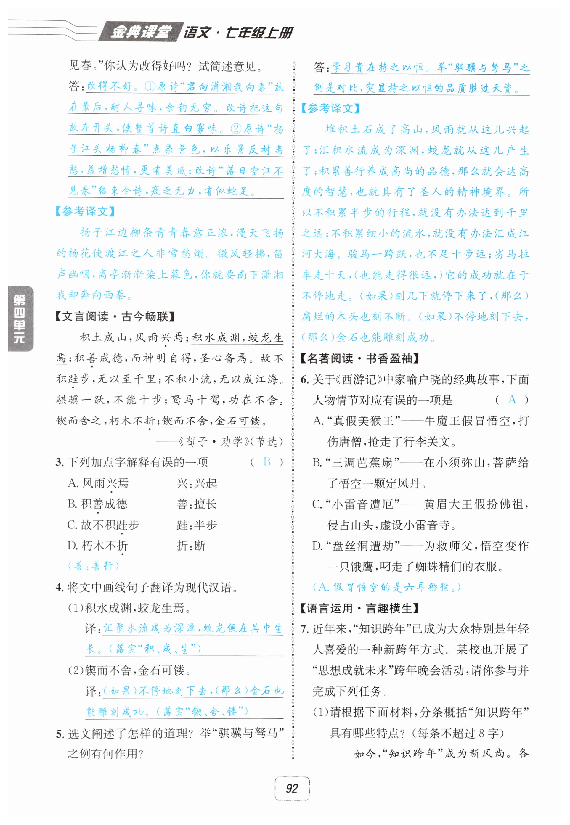 注:目前有些书本章节名称可能整理的还不是很完善,但都是按照顺序排列的,请同学们按照顺序仔细查找。练习册 2025年名校金典课堂七年级语文上册人教版 答案主要是用来给同学们做完题方便对答案用的,请勿直接抄袭。