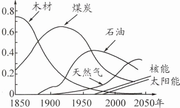答:从1850至2050年间,木材消耗量大幅减少,煤炭、石油的消耗量在经历了一个增长期之后均呈下降趋势,天然气、核能与太阳能的消耗量持续增长。