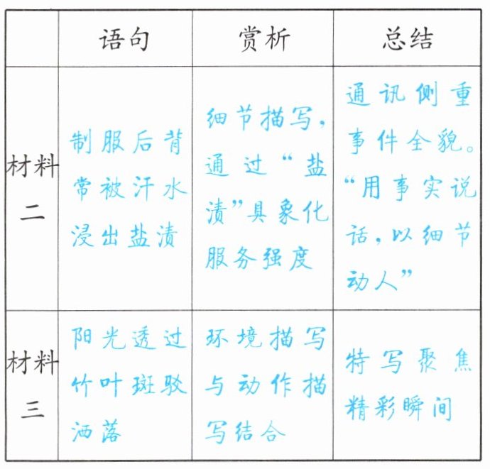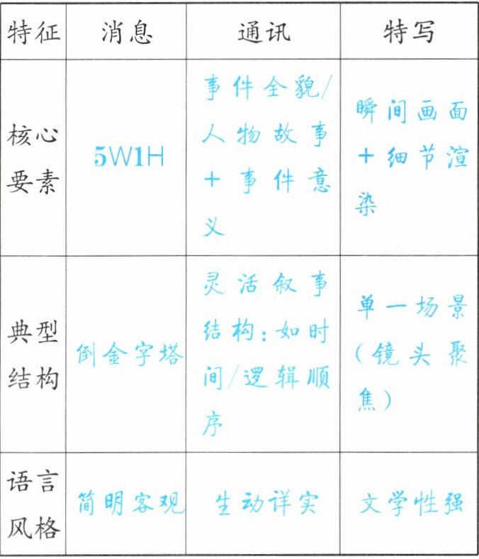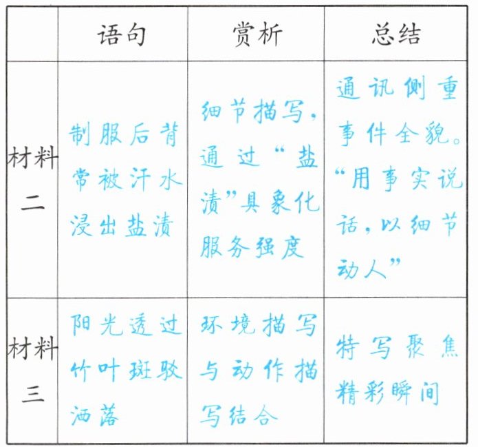 请结合材料二和材料三进行批注式阅读,分析特写与通讯在选材角度的区别,完成以下表格。