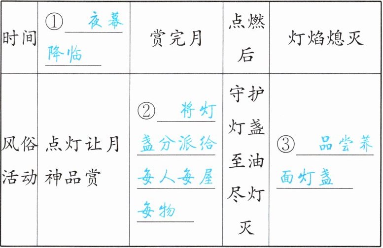 5.按照时间顺序梳理文中元宵夜“点荞面灯”的风俗活动,填写下面的表格。