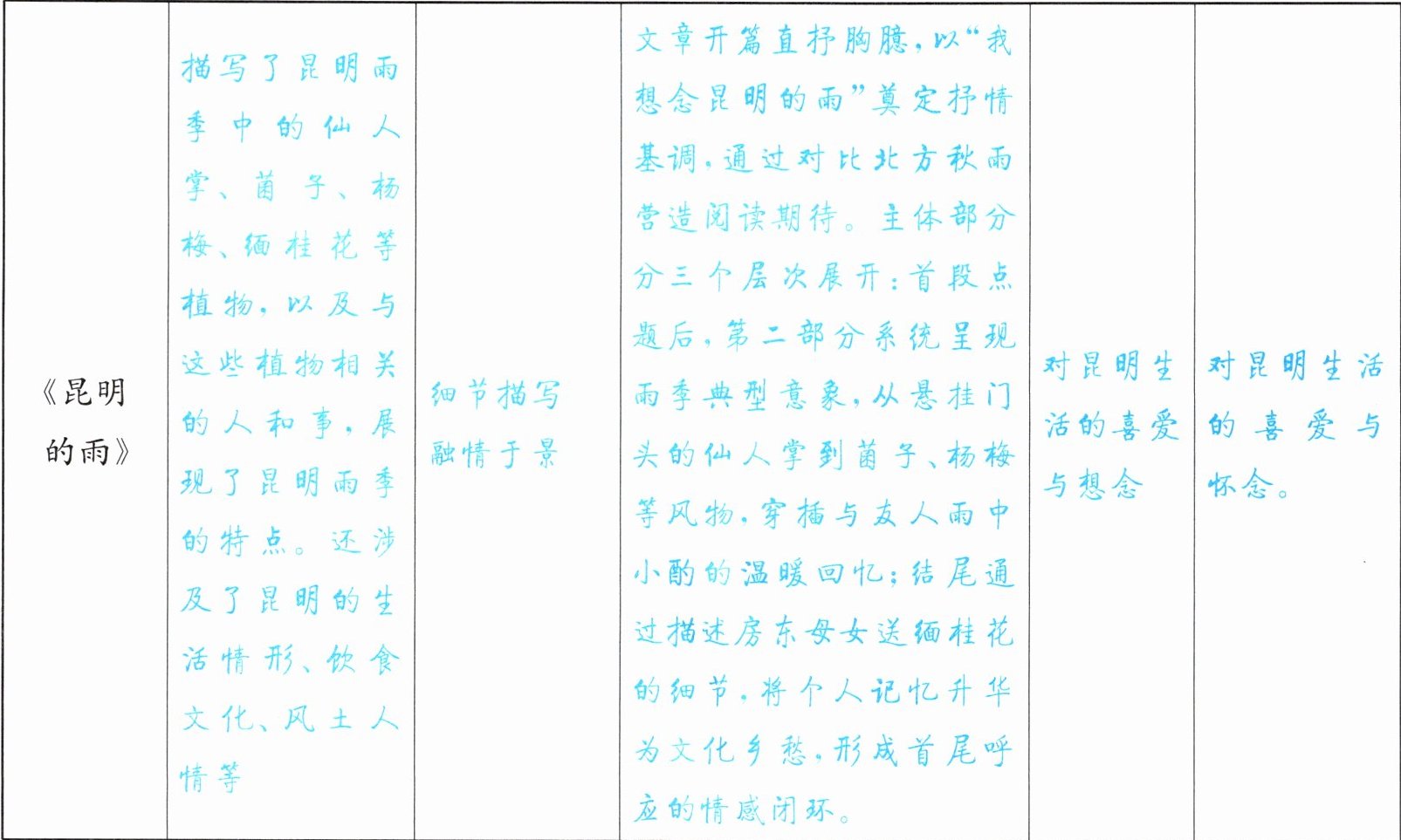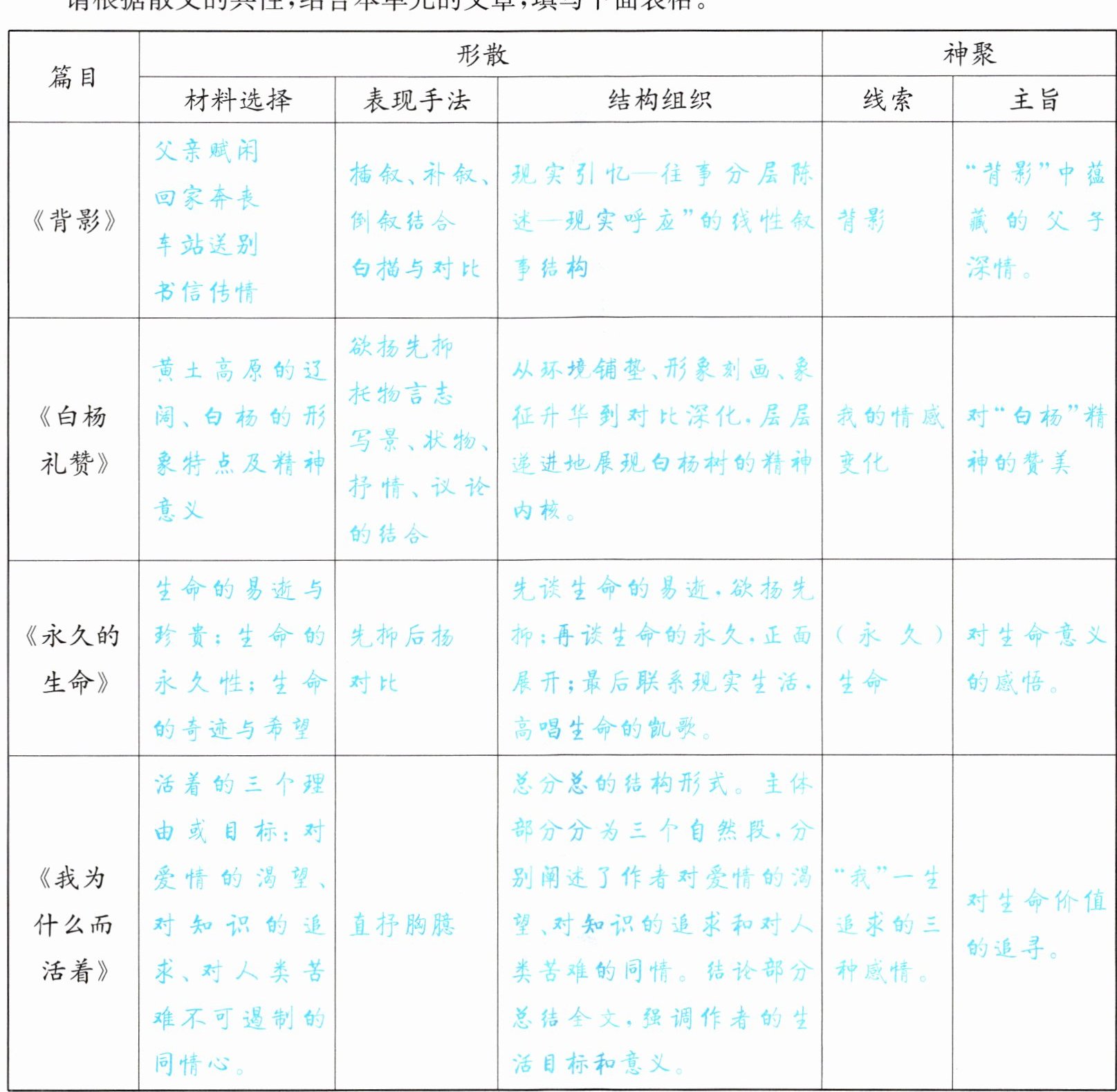 请根据散文的共性,结合本单元的文章,填写下面表格。