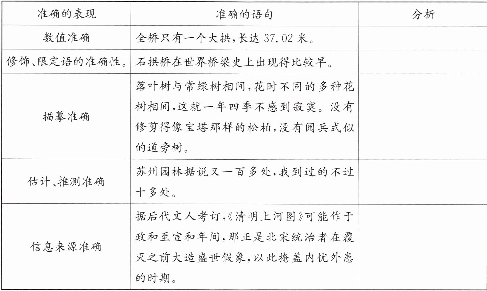 准确是说明文语言的首要特点。你如何理解准确?如何让自己的语言准确,请结合本单元的课后“思考探究”练习,根据“准确”的不同表现,填写下面的表格,积累相关语句。