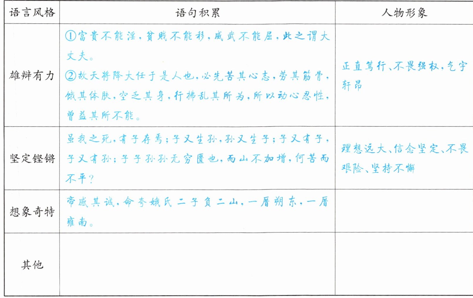 本单元的文章,语言风格鲜明:或雄辩睿智,或想象奇特,或叙事生动。语言的背后是时代风云下鲜活的人物。请根据提示,积累相应的语言。