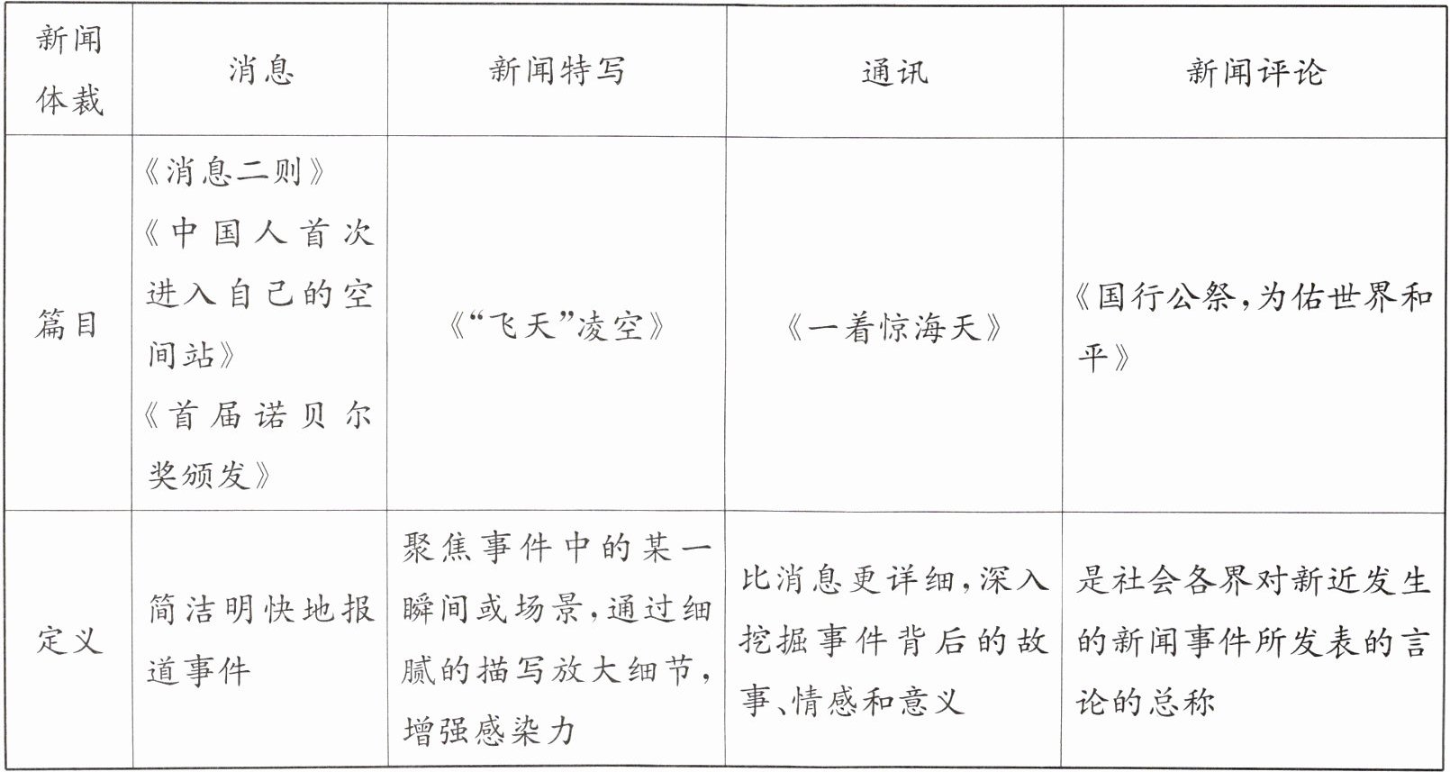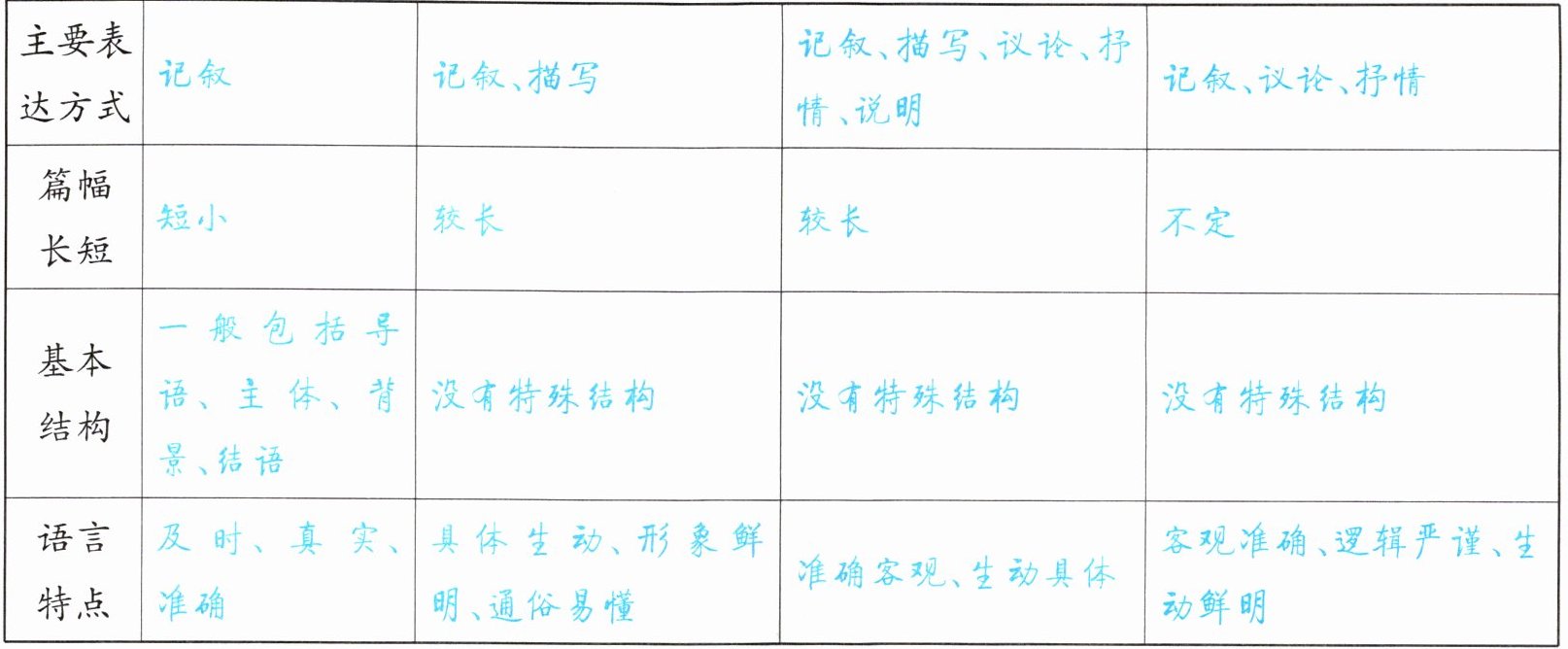 新闻体裁是指新闻报道作品的规范化的基本类别和样式,随着新闻事业的发展,新闻体裁也在不断演变和丰富。请完善下面的表格,认识新闻体裁的主要分类及其特点。