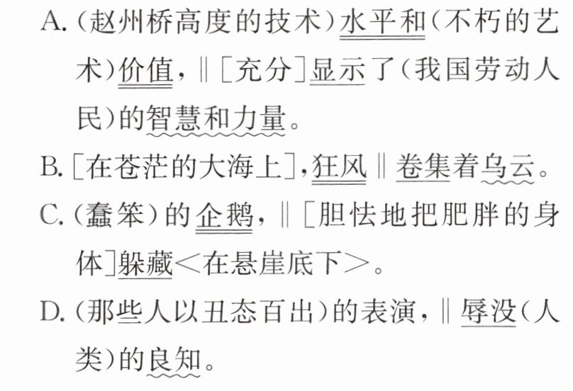 D; 【解析】D。那些人‖[以丑态百出的表演],辱没(人类)的良知。