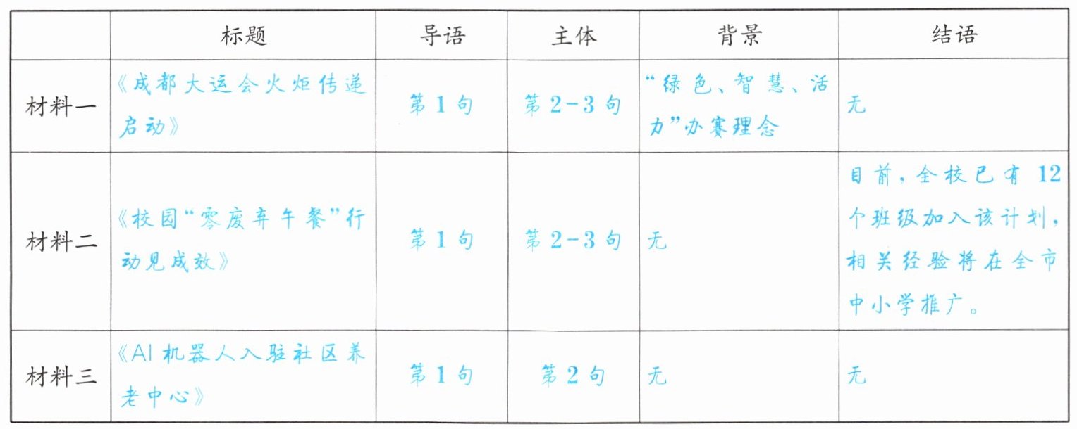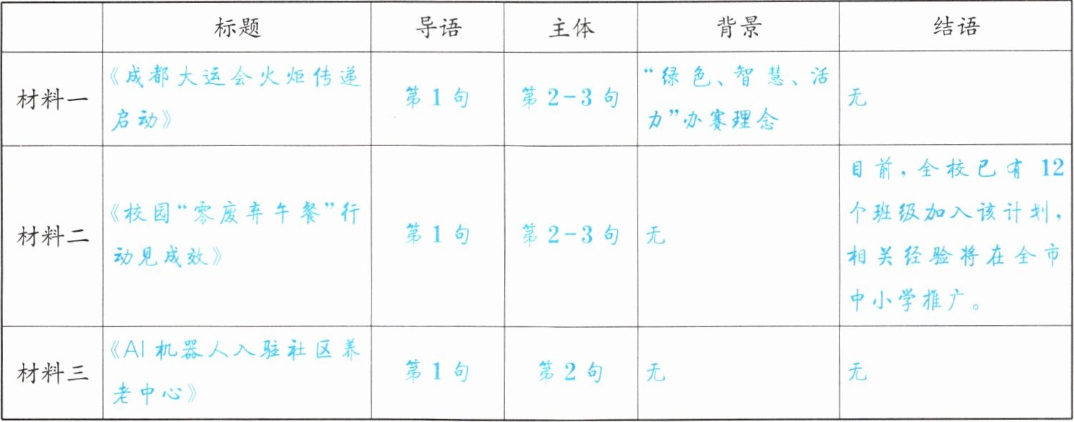 材料二:时间(2024年2月起);地点(成都市实验中学);人物(八年级1班师生);起因(环保需求);经过(推行垃圾分类、堆肥);结果(全校推广,计划全市推广)。
