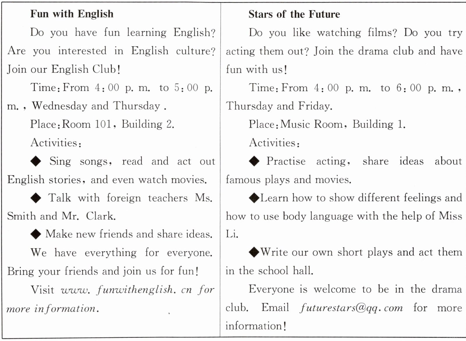 )1. What time can students join the English club?A. At 4:00 a.m.,every Thursday.