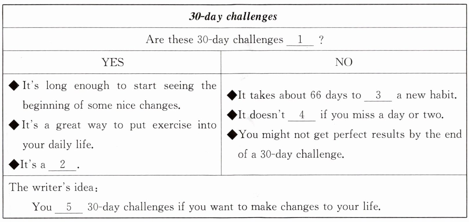 If you want to make changes to your life,try 30-day challenges(挑战)! You just pick(挑选)something to do for 30 days,like exercising or writing in a diary. Many people do this to start a new habit. But do these 30-day challenges really work? Well,yes and no. “Thirty days is certainly long enough to start seeing the beginnings of some nice changes,”Mike Siemens,a US expert(专家),told NBC News. Siemens said that 30-day challenges are a great way to put exercise into your daily life. To start a 30-day challenge,make sure it is a goal(目标)that you want to get to and that it's not too hard. Of course,Rome wasn't built in a day. Scientists say it takes about 66 days for a new habit. It's OK if you miss a day or two. You might not get perfect(完美的)results by the end of a 30-day challenge. But it's still a good start.