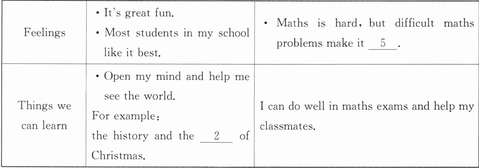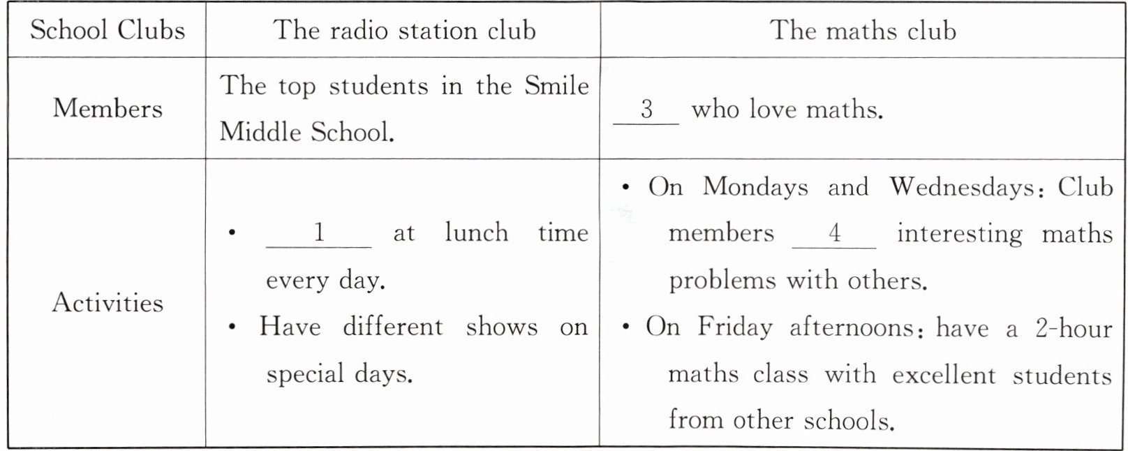 We also have other clubs. I am in the maths club. All the students can join it if they love maths. There is no exam. On Mondays and Wednesdays we tell others some interesting maths problems. On Friday afternoons, we can even go to the school hall to have a 2-hour maths class with excellent students from other schools. Maths is hard for me, but I'm interested in the difficult math problems! I learn a lot in it. Now I can do well in maths exams and help my classmates. I feel really happy to join this club. But I still need to learn more.