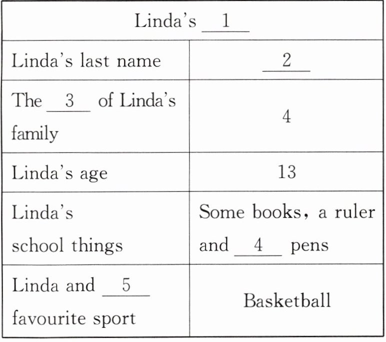 Hello! My name is Linda Cook and I'm 13. I'm English. My father is a teacher. I'm his student. My mother is a doctor. I have a brother. His name is Jack. He is 8. His favourite colour is green. His pencil box is green. I like blue, so my schoolbag is blue. I have some books, a ruler, and two red pens and four black pens in my schoolbag. My jacket is in my schoolbag, too. It's yellow. My mother likes yellow. I get it from my mother. Mary and Jenny are my best friends. We all like basketball best. We often play it after class. Look! That is their basketball on the floor.