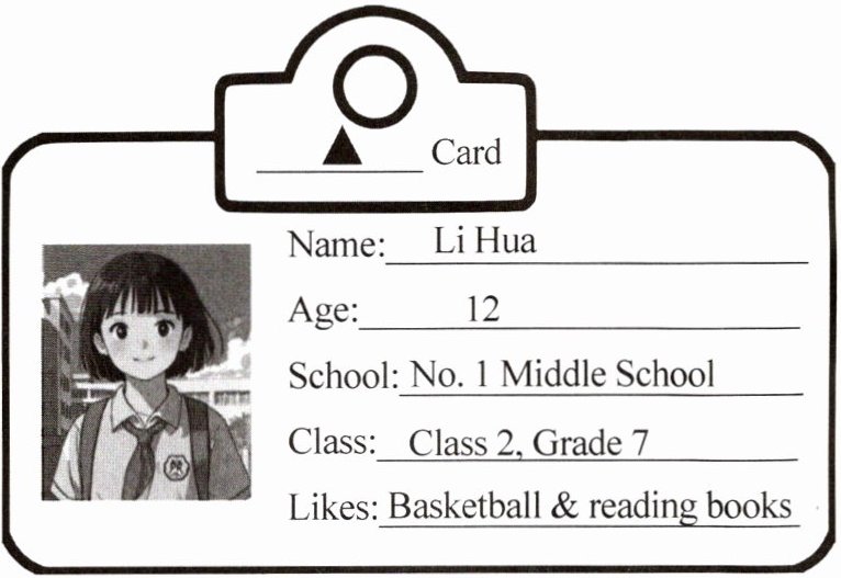 I'm Wang Xia,from No. 1 Middle School. I'm 13 years old. This morning,I see a card on the school playground. Whose card is it? Let me have a look.(After reading the card)I think I can go to her class and find her or tell her class teacher.