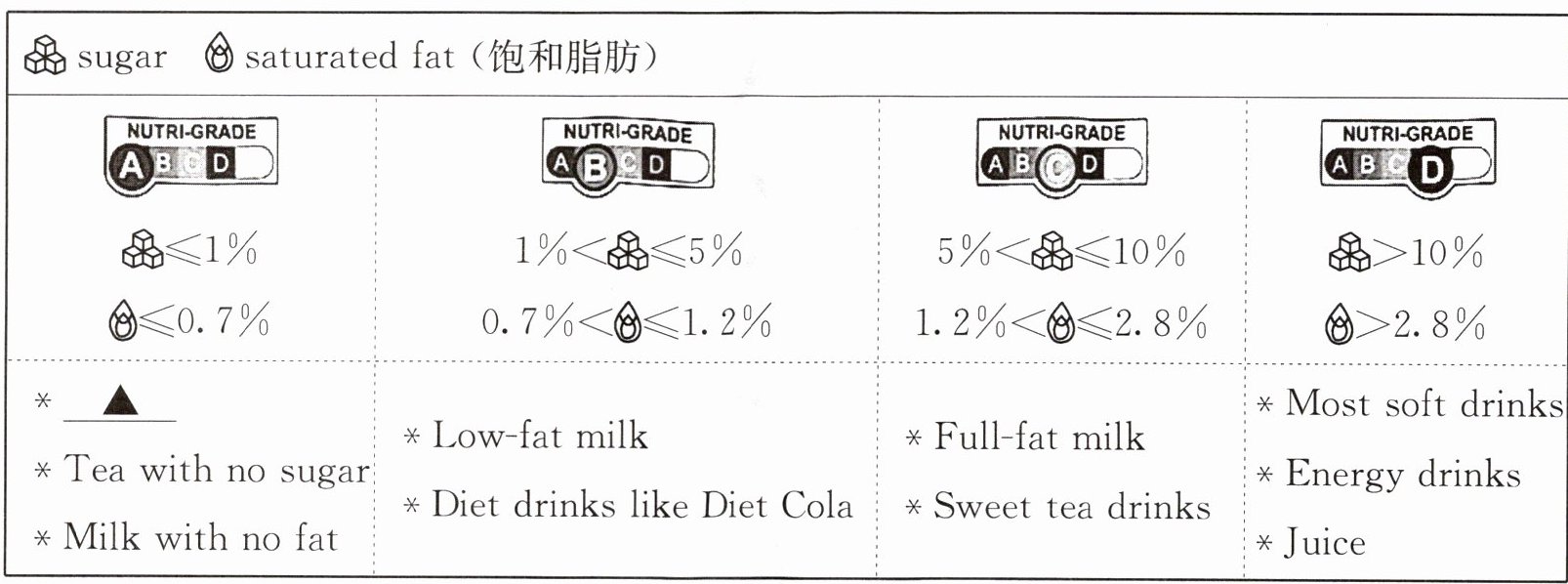 “Singapore started to put NUTRI-GRADE labels(营养等级标签)on every drink. They are from A to D, and A is the healthiest. So, when people go to the store, they look at the labels. With these labels, people can easily see which drinks are healthier. They help us make better choices, like picking an A-label drink over a D. Here are the NUTRI-GRADE labels for different drinks.”