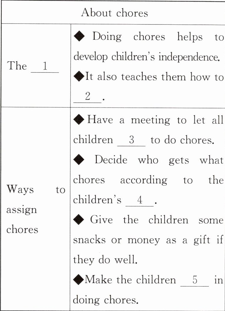 Many children are unhappy to do chores. As a student,it is not enough to just get good grades at school. Doing chores helps to develop children's independence(独立性)and teaches them how to look after themselves. Also,as a member of the family,it is their duty to do their part in doing something like doing the dishes after meals. So,it is important for parents to know how to assign(分配)chores.