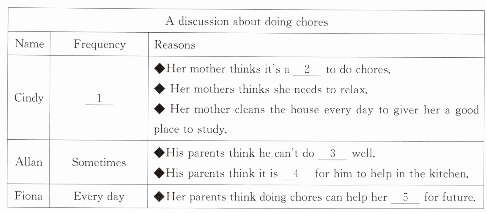三、完成图表。根据短文内容,完成图表格中所缺信息。