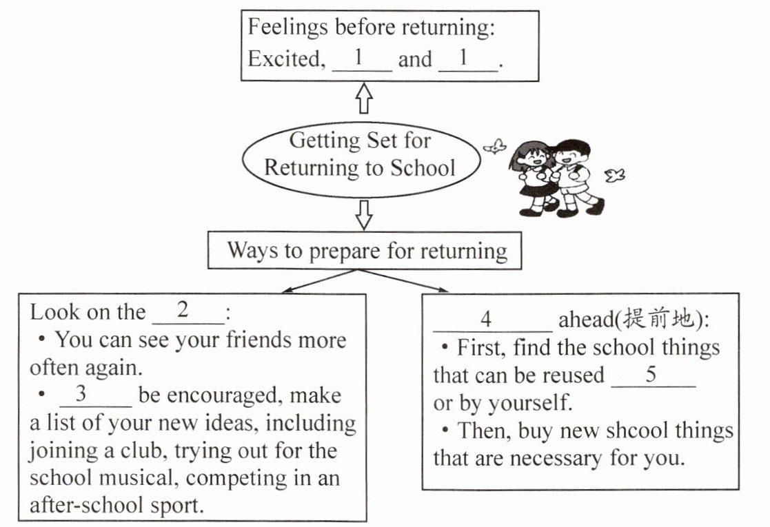 sad; nervous; bright/good/positiveside(s); Inorderto/To; Prepareschoolthings; with your parents' help/with your parent'shelp/by asking your parent(s) for help