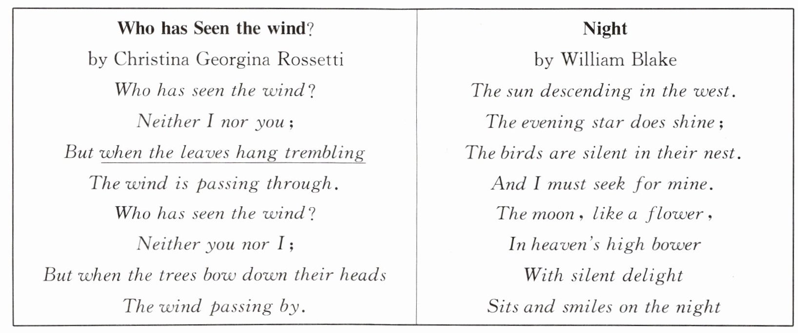 When we read the lines "When the leaves hang trembling" and "When the trees bow down their heads",they remind us of a windy day. The poet successfully creates an image of the wind by describing details of the scene. These help the readers think of the moment when the wind passes by. We might even bow our own heads,imagining that we are the trees.