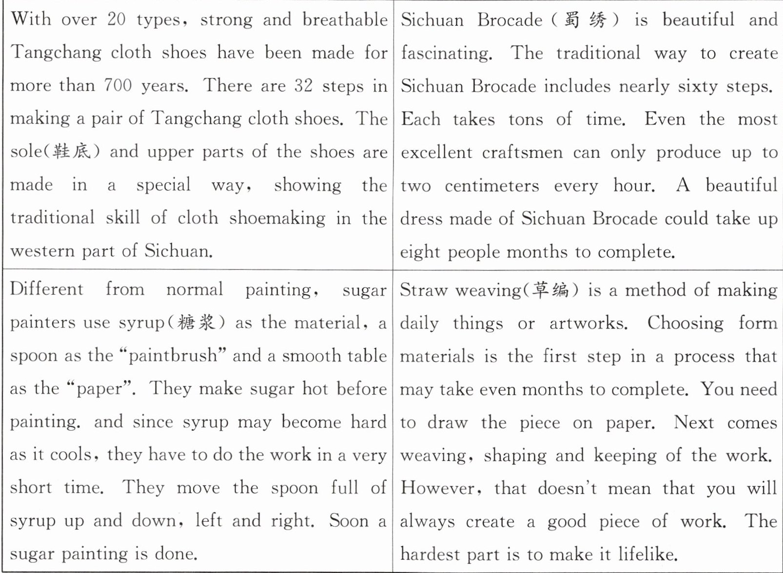 )1. What do Tangchang cloth shoes and Sichuan Brocade have in common?A. They both need many steps to complete.