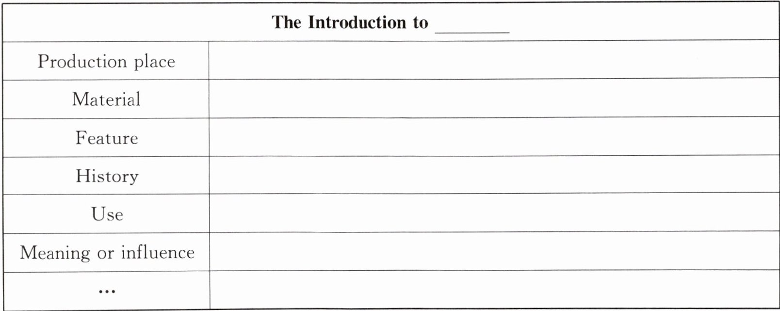 为了传承中国传统文化,请根据表格内容,写一篇短文介绍一种传统艺术品,并谈谈你对保护中国传统文化的看法和建议(各2点)。(请先完善表格内容和信息)