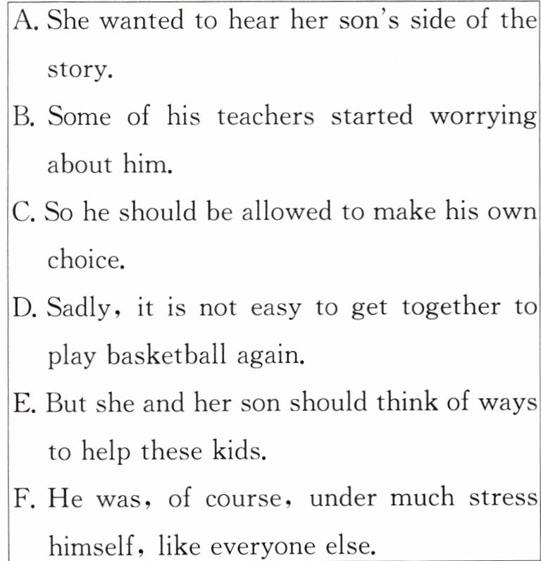 五、补全短文。根据短文内容,从短文后的A~F选项中,选出5个适当的选项补全短文。